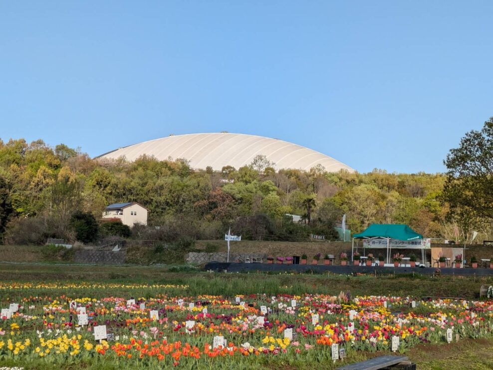 写真上から4枚目、奥の白い屋根は「クラサスド-ム大分」、日韓ワールドカップサッカ-が開催された競技場です